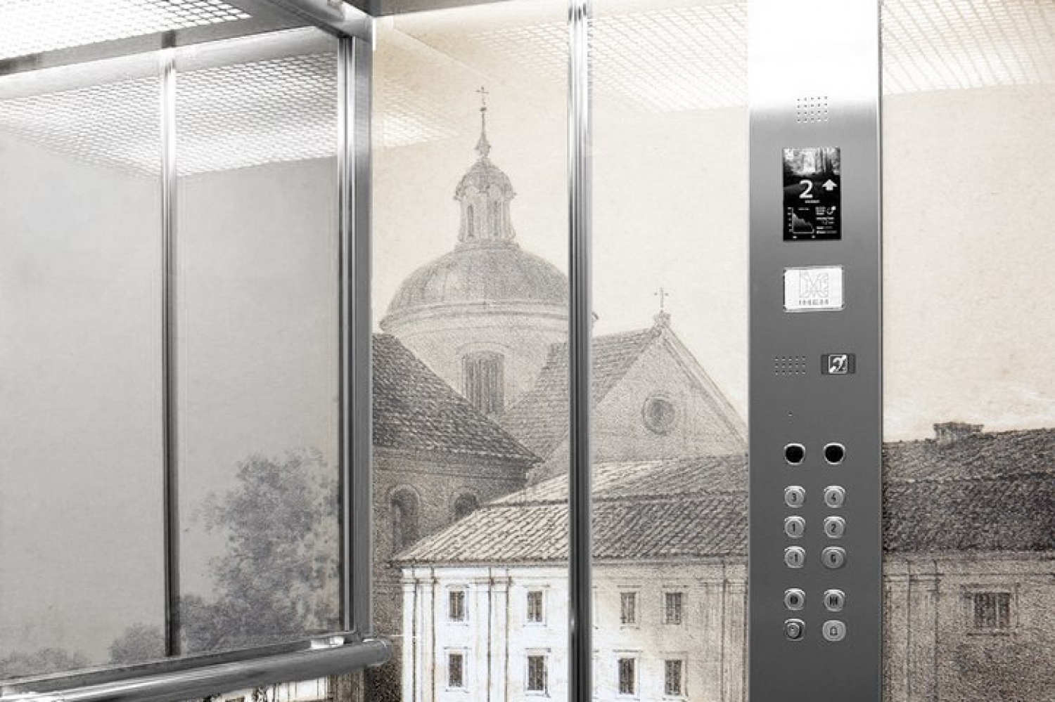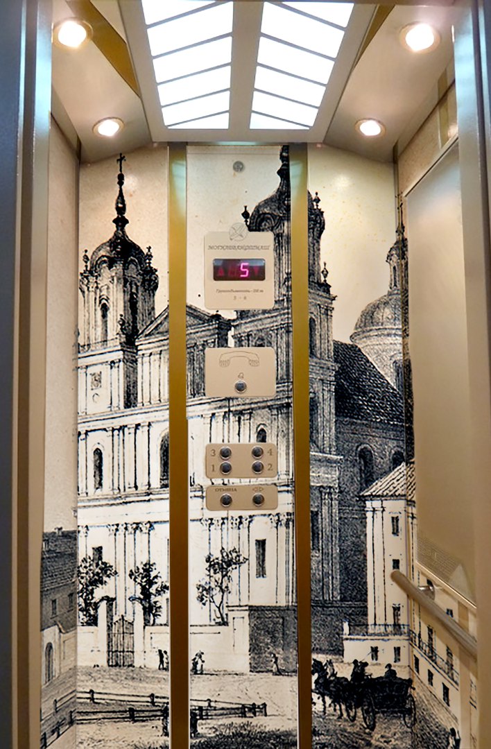 Ліфт упрыгожылі літаграфіяй карціны з касцёлам св. Францыска Ксаверыя ў Гродне.