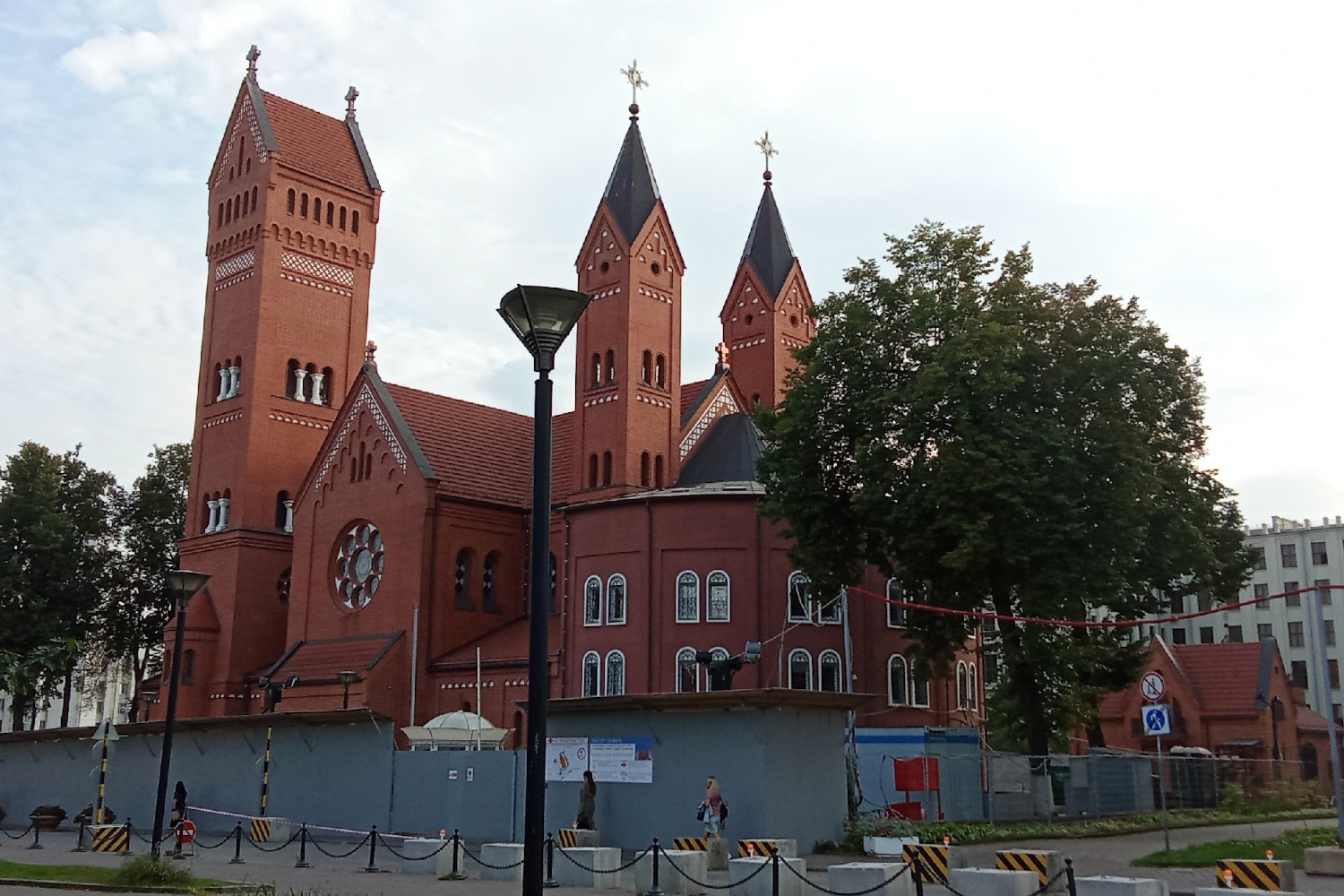 У Мінску працягваецца рэканструкцыя комплексу каталіцкага храма святога Сымона і святой Алены, вядомага як Чырвоны касцёл. Свежыя фота, як прасоўваюцца працы, мы заўважылі ў сацсетцы.
