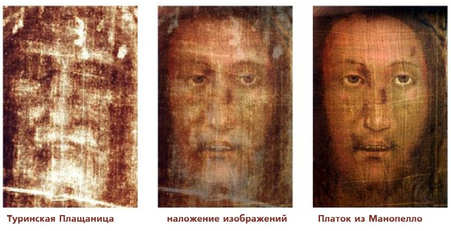 При цифровом наложении пленки с изображением из Манопелло на Лик с Плащаницы черты лица (глаза, нос, рот) совмещаются, подтверждая, что это один человек. Наложение изображений показывает их полное графико-математическое совпадение. Исследования подтверждают, что оба отпечатка соответствуют одному и то же лицу по структуре и параметрам.