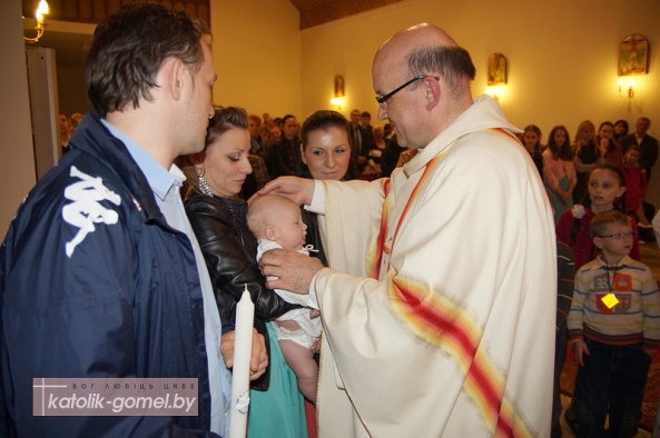 Традыцыйна на Велікоднай імшы ў гомельскай рыма-каталіцкай парафіі хрысцілі нованароджаных дзяцей. У гэты раз сакрамэнт хросту быў удзелены чатыром немаўлятам, прычым, дваіх з іх хрысцілі падчас Велікоднага усяночнага чування.