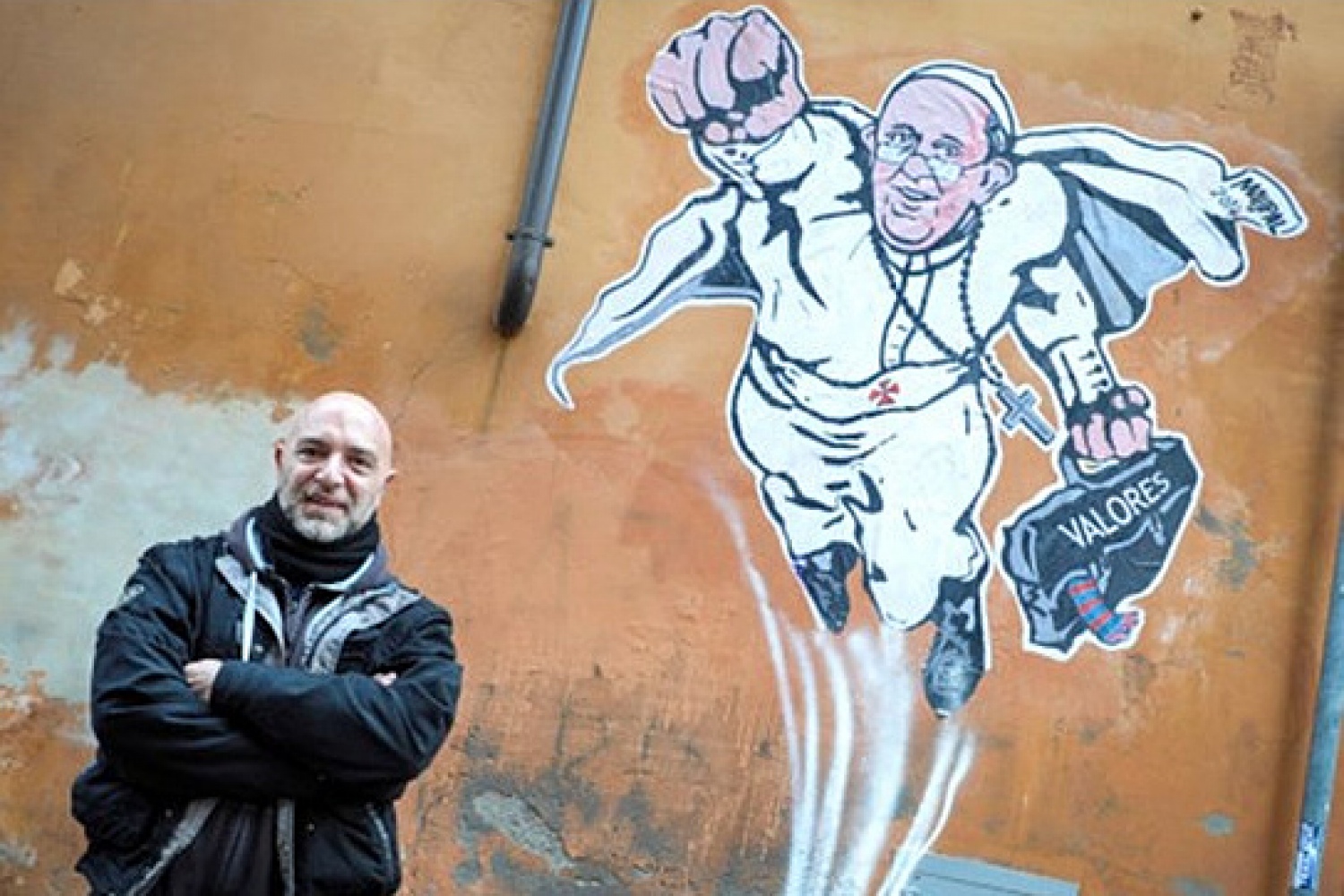 Граффити с Папой в образе супермена появилось на знаменитой улице Борго Пио недалеко от площади св. Петра, которую ежедневно посещают тысячи паломников, в 2014 г. Франциск был изображен в типичной позе супермена с белой пелериной, которая витает на сутане, с вытянутой правой рукой, сжатой в кулак. В левой руке он держал черный портфель подобный тому, с которым путешествует. На нем была размещена надпись "valores", то есть ценности. С портфеля виднелся шарф в цветах футбольной команды "San Lorenzo" из Буэнос-Айреса, сторонником которой уже много лет является Франциск.