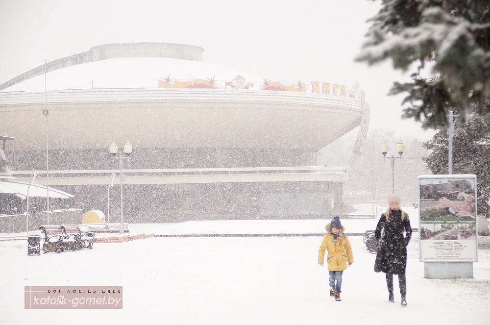 Настоящая метель накрыла Гомель 26 октября. За полдня снегу навалило по щиколотку, при том, что снег мокрый и быстро тает. Крыши, дороги, ветви деревьев и провода линий электропередач полностью побелели.