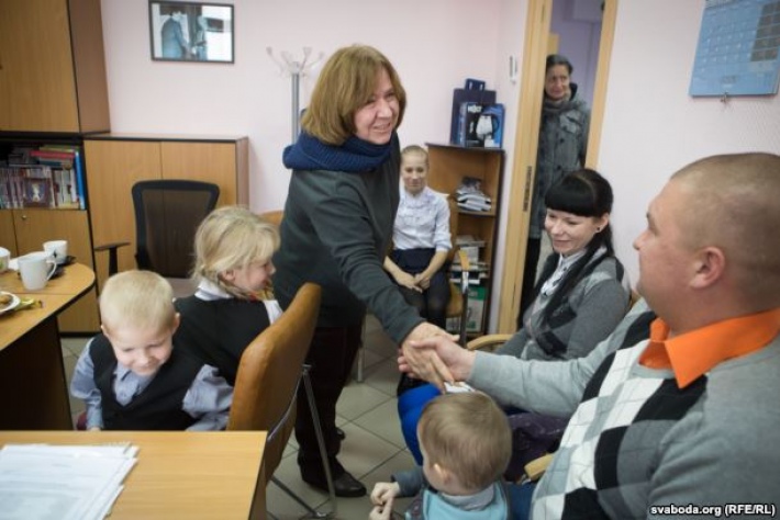 «Я считаю, что каждый из нас мог бы спасти одного-двух человек. И это было бы большое дело», - в Минске Нобелевская лауреат встретилась с многодетной семьей Любови и Василия Ревенко. Об истории молодых родителей из Слонима Светлана Алексиевич узнала из публикации на Радио Свобода.
