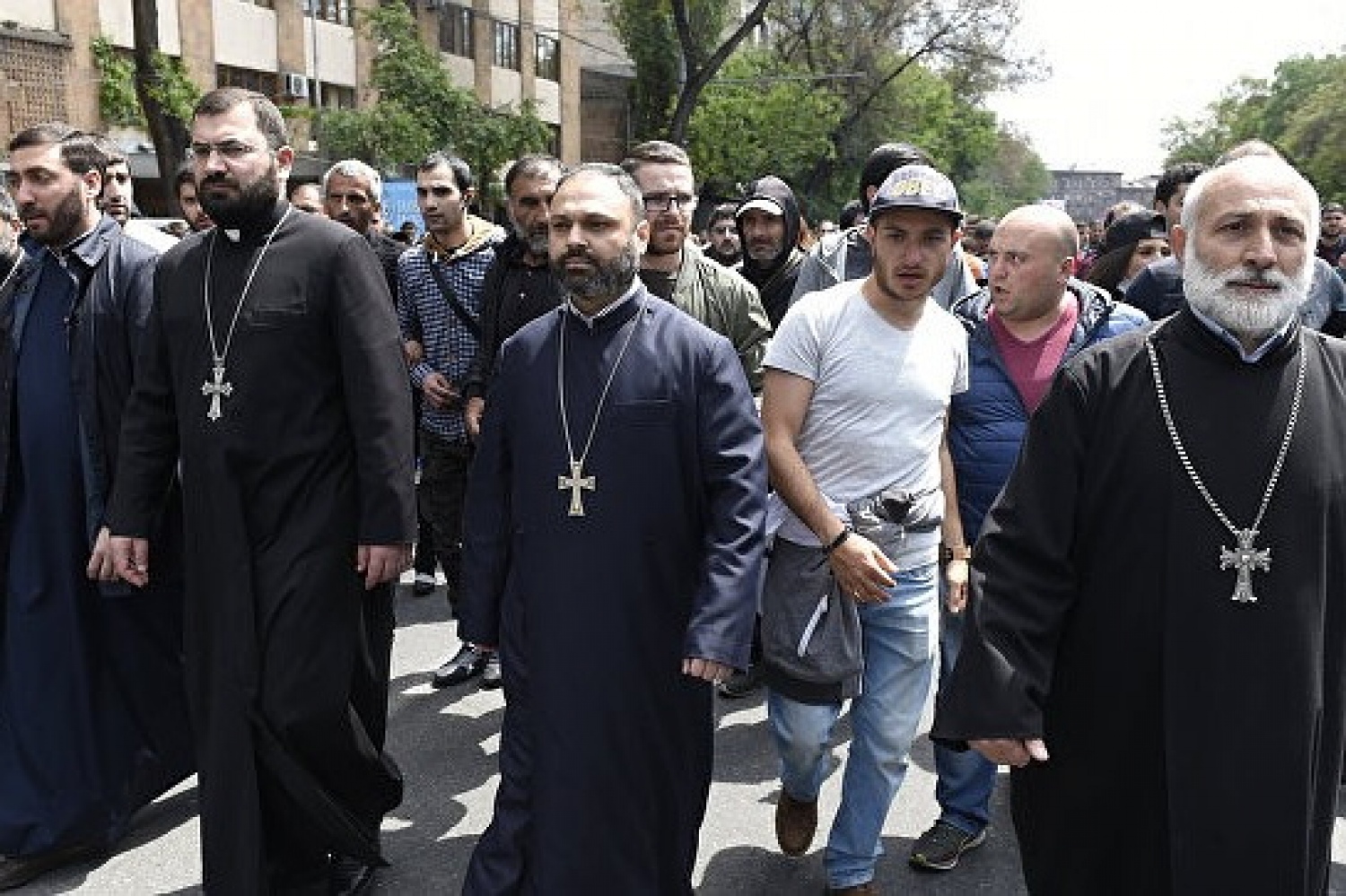 Почти две недели в Ереване и других городах Армении проходят массовые протеста против правительства. Полиция применяет силу к митингующим, сотни были задержаны. Когда очередное шествие митингующих было остановлено полицией и силовики применили спецсредства, на улицу вышли священники. Они встали между митингующими и полицейскими, не позволяя бить людей. Полиция обратилось к духовенству, чтобы те смогли убедить оппозицию прекратить протесты. Священники стали перед колонной людей, защищая митингующих.