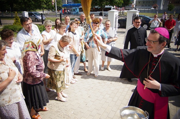 Свое общение с гомельскими католиками высокий гость начал с улыбки. Окропляя верующих святой водой, он пошутил: «Это святая вода против комаров!» (кусачие насекомые в последние дни заполонили Гомель - ред.).