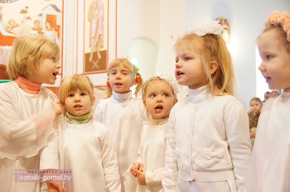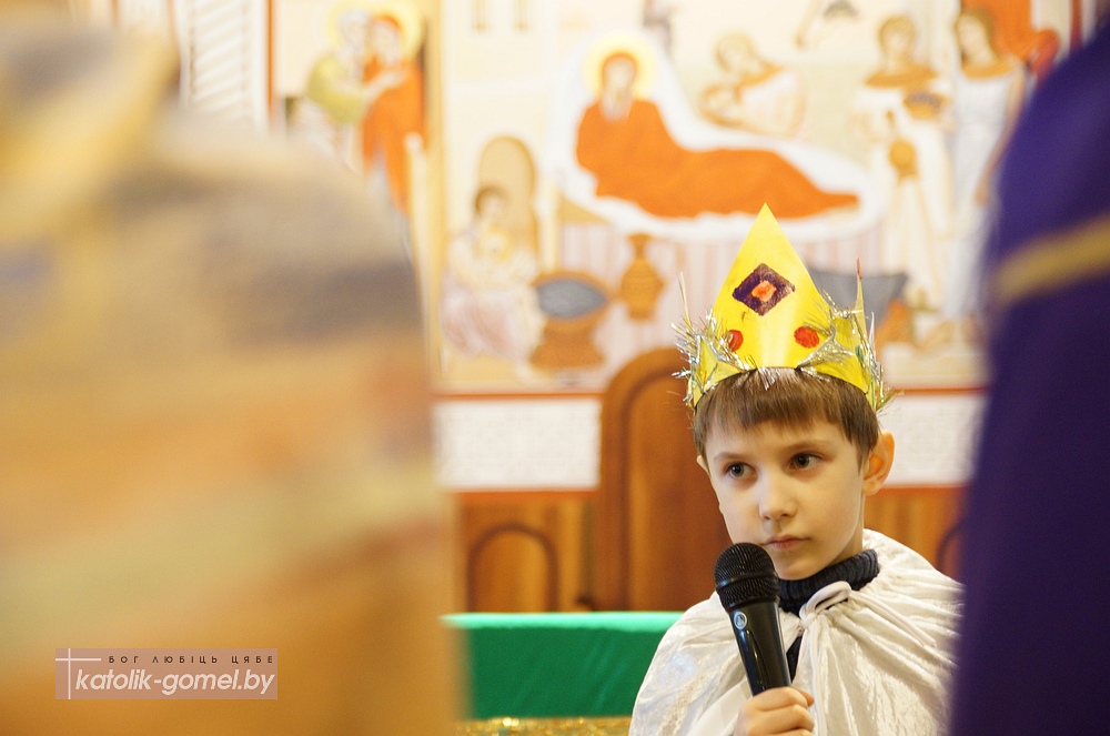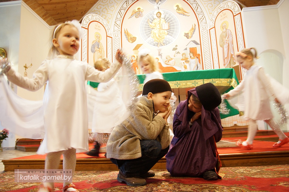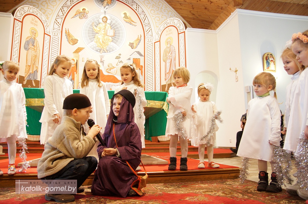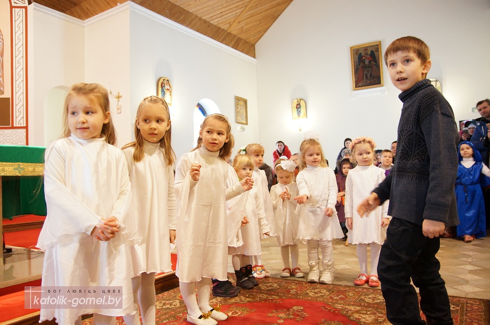 В завершение Рождественского периода в Католической церкви дети прихожан гомельского костела показали традиционную Рождественскую сценку. С помощью сестер ордена Матери Терезы дети рассказали о Рождестве на понятном для всех языке, с песнями и танцами. А настоятель прихода отец Славомир напомнил, что Вифлеем находится в сердце каждого человека, именно там хочет родиться Иисус Христос. И главный подарок на Рождество делает сам Господь - Он дает нам любовь и Вечную жизнь.
