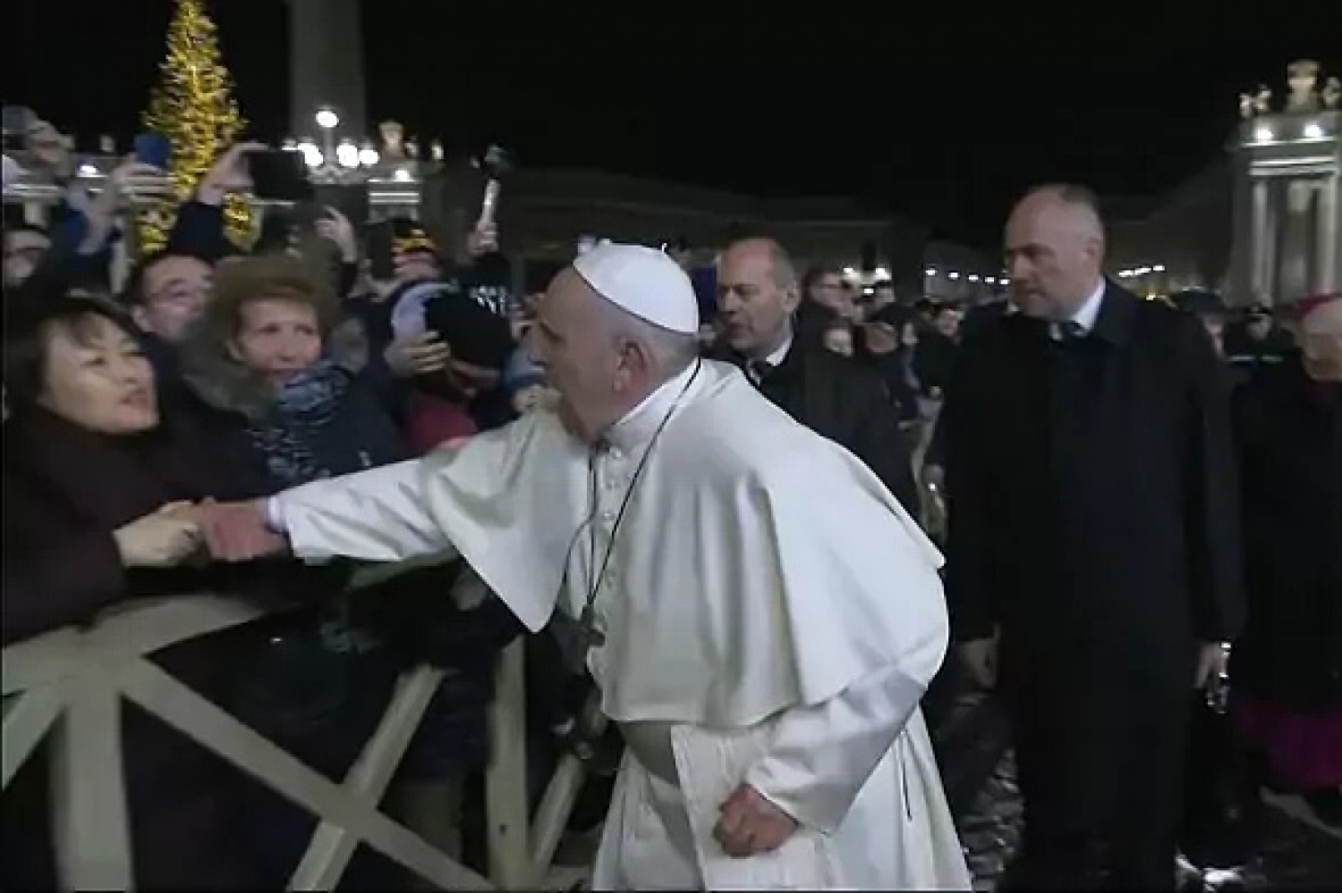 Что же случилось? В новогодний вечер на площади святого Петра в Ватикане, когда Понтифик подошел к людям, чтобы поприветствовать их за руку, одна женщина вдруг сильно потянула Франциска к себе за руку. За секунду до этого он отвернулся, направившись в другую сторону, и поступок женщины стал для Понтифика полной неожиданностью. Судя по выражению лица Папы, ему стало больно, и он хлопнул женщину, которая его удерживала, по руке. Полностью ожидаемая естественная реакция. Наверняка другие бы на месте Франциска отреагировали бы жестче. Однако этот инцидент стал чуть ли на главной новостью Нового года.