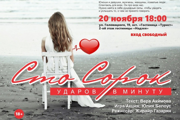 Моноспектакль «Сто сорок ударов в минуту. История потерянного детства» по пьесе Веры Акимовой создали и привезут в Гомель россияне - режиссер Жирайр Газарян и актриса Юлия Белоус. В ярком свете софитов на стуле сидит актриса. Она рассказывает историю. На экране за ее спиной мелькают фотографии и фрагменты текста. Спектакль идет 70 минут без антракта. История, которую рассказывает, выкрикивает, хрупкая девочка - на пределе человеческого восприятия.