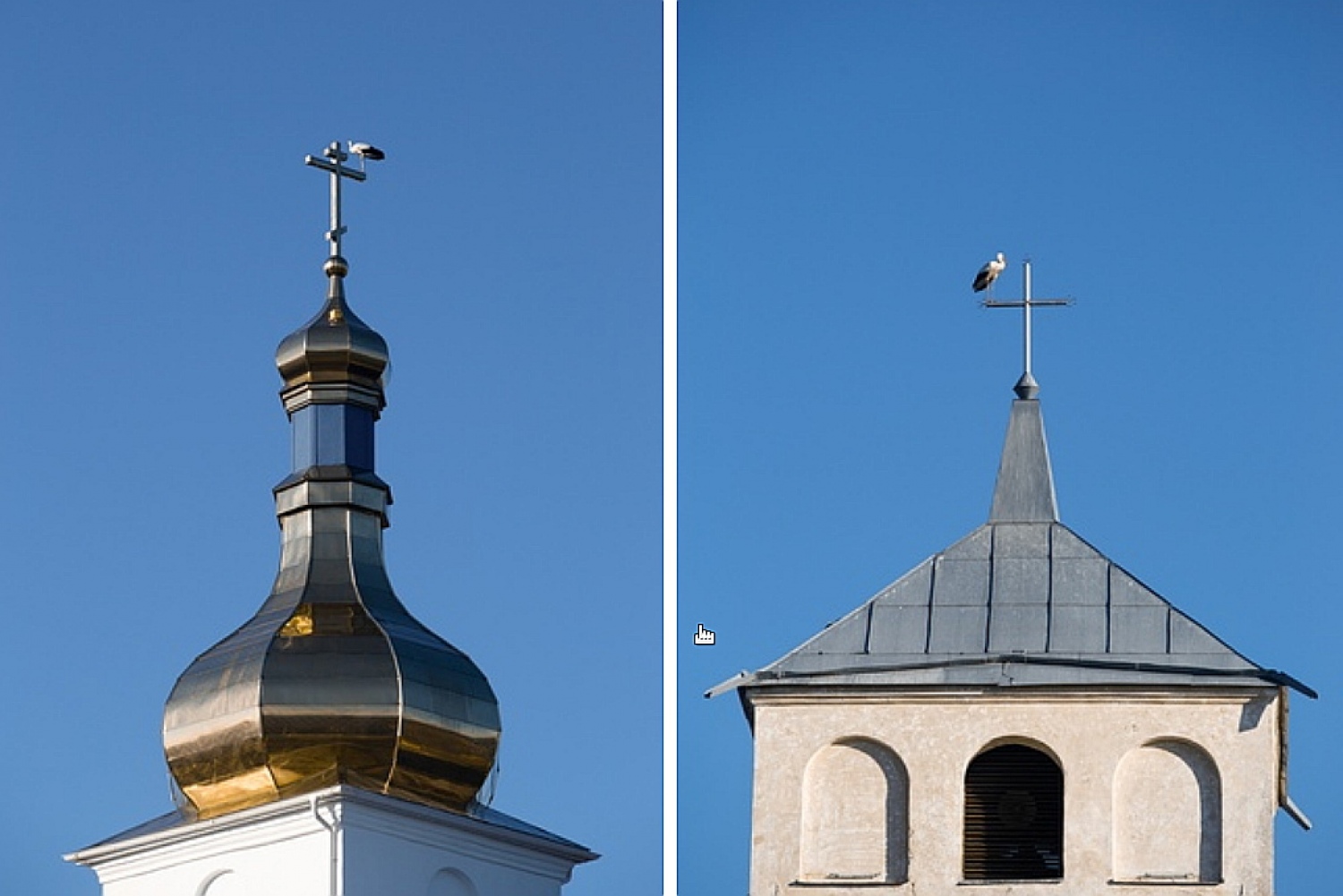 Можна было б пажартаваць: у адной сям'і буслоў жыве і «праваслаўны», і «католік». Вельмі сімвалічна для Беларусі, якая знаходзіцца на мяжы Усходу і Захаду, і дзе шматлікія сем'і змешаныя ў плане веравызнання.