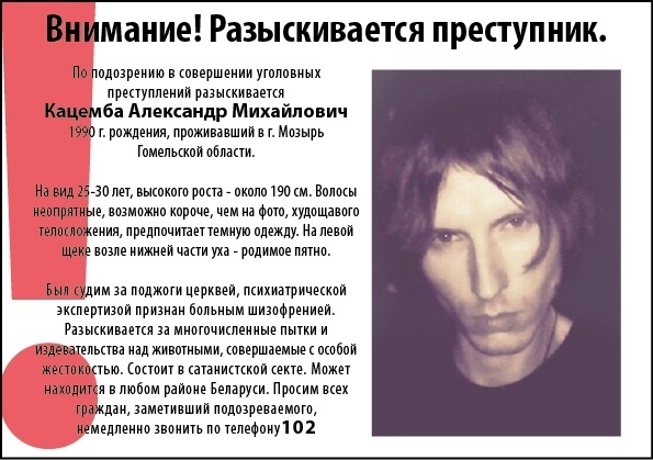 Как сказано в ориентировке, молодой человек был судим за поджоги храмов в Мозыре, ранее состоял в секте сатанистов, страдает психическим заболеванием.