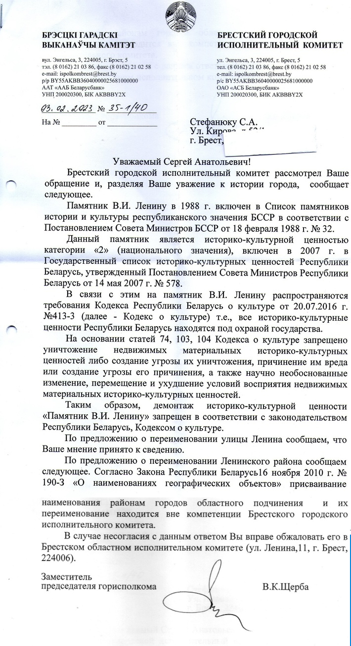 Верующий опубликовал полученный из горисполкома ответ. В нем говорится, что памятник Ленину признан историко-культурной ценностью, поэтому демонтаж его запрещен законом. А мнение жителя о переименовании улицы Ленина «принято к сведению».