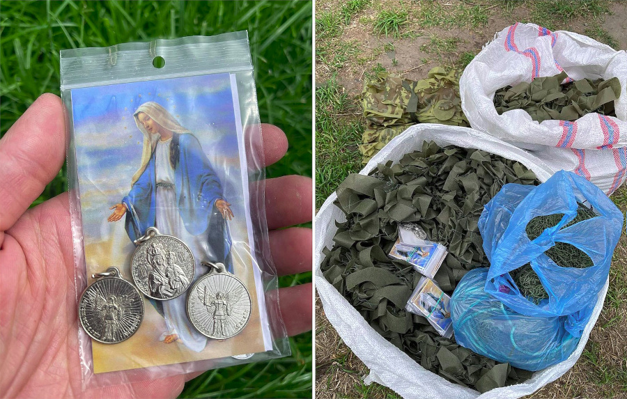 «У канцы траўня мы адпраўлялі сеткі мінамётчыкам у Харкаўскую вобласць. Я ўклаў медальёны ў сетачкі і адправіў у бліжэйшы аддзяленне Новай пошты, якое знаходзіцца кіламетрах у 20 ад лініі баявога сутыкнення. Мне тэлефануюць і кажуць: усё, што ехала ў тое аддзяленне, згарэла. Прыляцела ракета і спаліла аддзяленне. Але якім жа было маё здзіўленне, калі я ўбачыў у дадатку НП, што сеткі цэлыя ляжаць на іншым складзе. Памылка аператара або машына не паспела даехаць? Сеткі з медальёнамі ацалелі і служаць цяпер хлопцам добрай абаронай. На медальёнах Божая Маці з Езусам і Архістратыг Міхаіл. На фота тыя самыя сеткі».