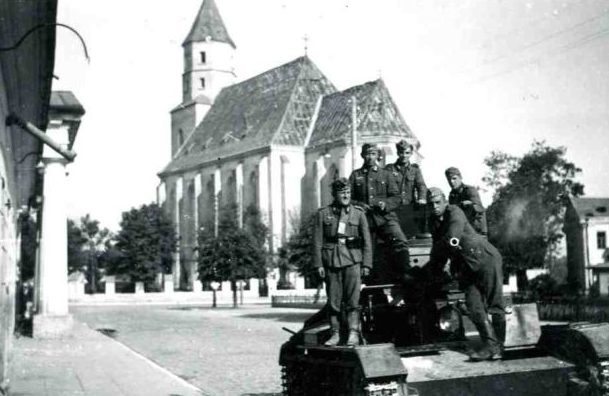 Бойцы Вермахта на оставленном на улице оккупированного города советском танке на фоне фарного костела XVI века. Гродно, 1941 г.