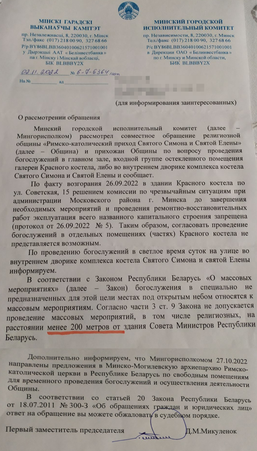 Рымска-каталіцкая парафія святога Сымона і святой Алены 8 лістапада апублікавала адказ Мінскага гарвыканкама на зварот аб магчымасці правядзення малітваў у закрытым Чырвоным касцёле.
