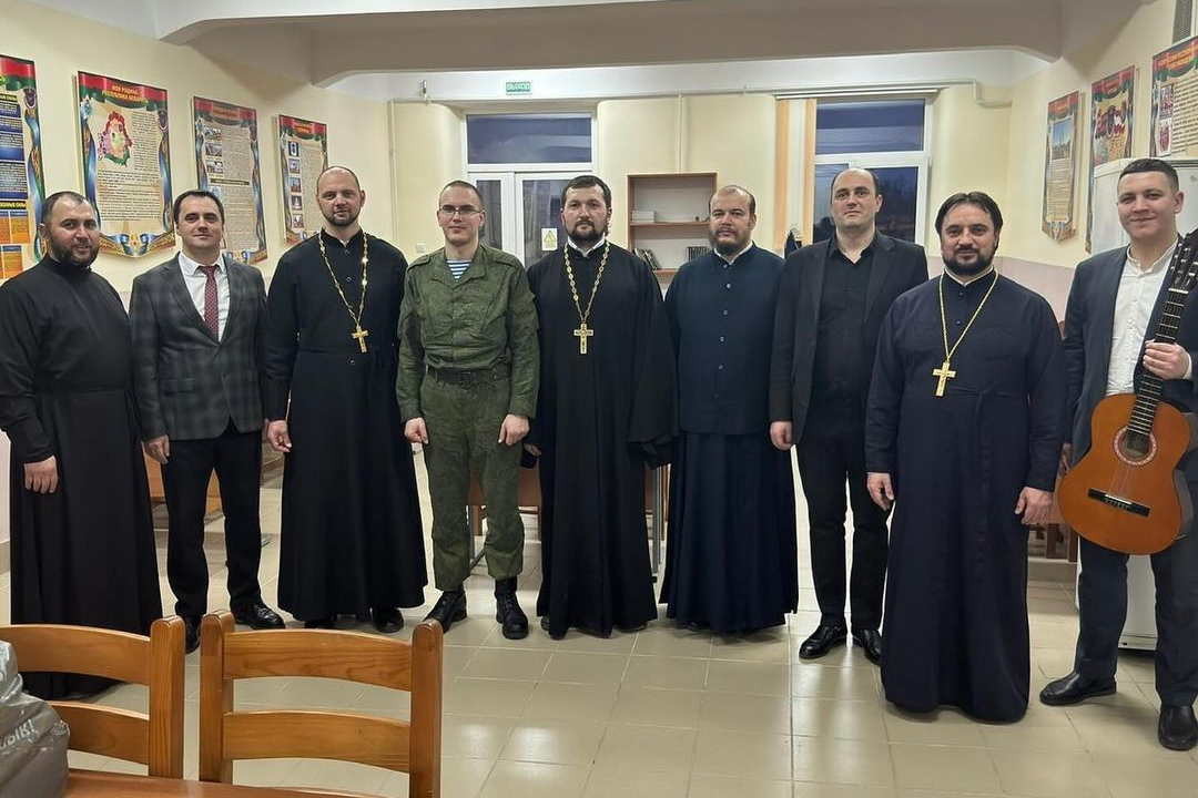 «Месяц назад клирики храма Святых Петра и Февронии в составе мужского хора Пинской епархии посещали 38-ю бригаду, чтобы молодым людям, несущим военную службу, рассказать о Боге, поздравить с праздником и поднять боевой дух своим выступлением, поддержать отца Артемия в его службе».
