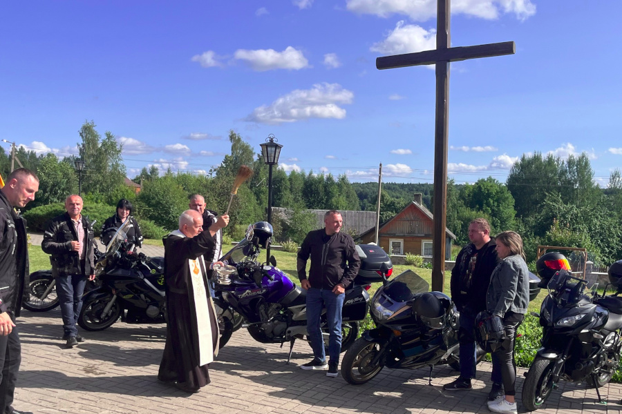 З розных куткоў Беларусі ў Гудагай прыбылі пілігрымы – у тым ліку байкеры з Астраўца. Яны атрымалі благаслаўленне і памаліліся перад абразом Маці Божай. Фота з пабліка парафіі глядзіце ніжэй.
