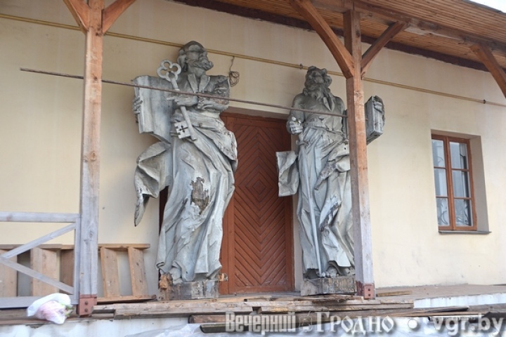 За время реставрации более чем двухметровые дубовые фигуры просушили, очистили, укрепили наиболее разрушенные элементы, пропитали специальными растворами и заново покрасили. Работа по обновлению скульптур заняла семь месяцев, они были сняты с фасада в феврале этого года. Реставрировали фигуры минские и гродненские мастера.