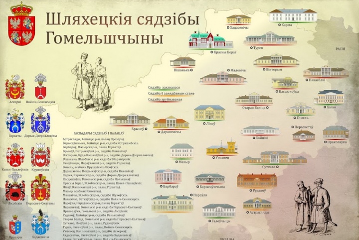 Як піша БелаПАН, на мапе прадстаўлены 27 сядзіб - і тыя, якія існуюць і сёння, і тыя, ад якіх засталіся толькі парэшткі ці наогул нічога не захавалася. Сядзібы будаваліся ў асноўным у стылі класіцызму, але сустракаліся і барочныя, і гатычныя. Гэта былі не толькі велічныя палацы, але і даволі сціплыя пабудовы. «На мапе прадстаўлены сядзібы, якія мы здолелі аднавіць. Але гэтае аднаўленне схематычнае, можам агулам убачыць архітэктуру, паглядзець старыя фотаздымкі, параўнаць з сучасным станам будынкаў. Выявы сядзібаў рэканструяваліся па розных крыніцах: малюнках, старых фотаздымках, успамінах былых жыхароў, апісаннях даследчыкаў», - адзначыў архітэктар Сяргей Ляпін.