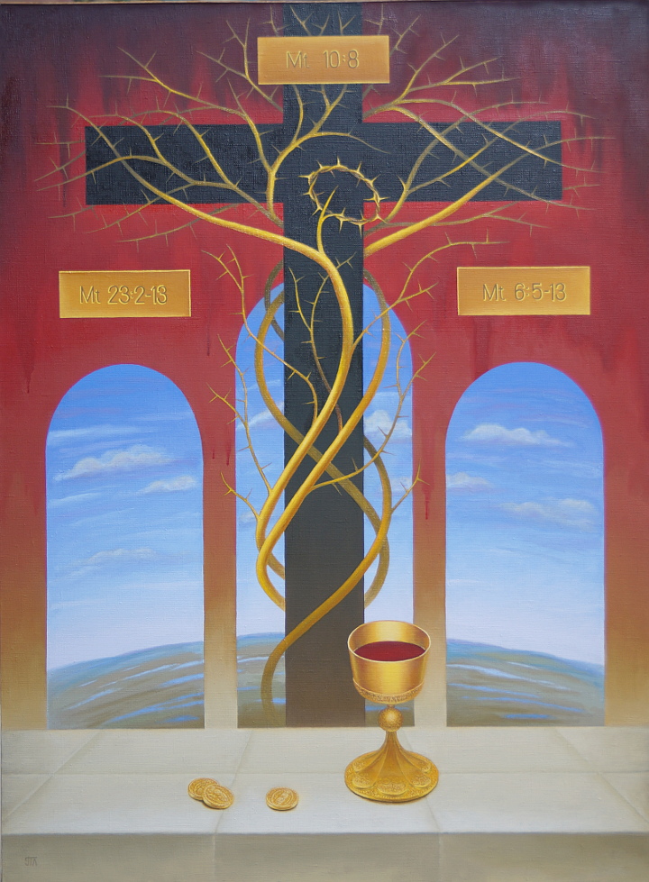 На выяве намаляваны крыж, які сімвалізуе вучэнне Ісуса, абвіты цярновы галінамі. Чара на пярэднім плане - у дадзеным выпадку сімвал абрадаў і дагматаў, усяго, што нарасло на вучэнне Хрыста. А манеты - гэта мамона. Каб заганы жылі, ім неабходны інструментар, грошы ж могуць служыць як мамоне, так і запаведзям Хрыста, тлумачыць мастак.
