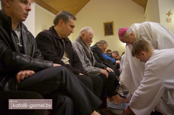 17 красавіка каталіцкія і праваслаўныя вернікі адзначаюць Вялікі чацвер, з якім пачынаецца Святы Пасхальны Трыдуум. Нагадаем, Вялікдзень хрысціяне ўсяго свету адзначаць у гэтым годзе ў адзін дзень - 20 красавіка. Традыцыйна ў Вялікі чацвер, калі Хрыстос устанавіў Сакрамэнт Эўхарыстыі і абмыў ногі сваім вучням, такія ж абрады выконваюць і святары - мыюць ногі 12 парафіянам-мужчынам. У некаторых царкоўных супольнасцях, у прыватнасці, Нэакатэхуменальнага шляху, вернікі таксама абмываюць ногі адзін аднаму ў знак раскаяння за асуджэнне і гатоўнасці служыць бліжняму. У Гомелі падчас Імшы Вялікага Чацвярга літургію абмывання ног здзейсніў біскуп Казімір Велікаселец.