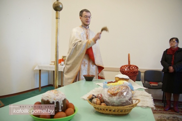 Грэка-каталіцкая парафія Трох свяціцеляў правяла ў гомельскім касцёле святочную Боскую Літургію Уваскрасення Хрыстовага ўвечары ў суботу, 19 красавіка. На службе прысутнічалі каля 10 мясцовых уніятаў. Пасля завяршэння Літургіі святар асвяціў Велікодныя стравы вернікаў.