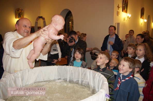 Традыцыйна на Велікоднай імшы ў гомельскай рыма-каталіцкай парафіі хрысцілі нованароджаных дзяцей. У гэты раз сакрамэнт хросту быў удзелены чатыром немаўлятам, прычым, дваіх з іх хрысцілі падчас Велікоднага усяночнага чування.