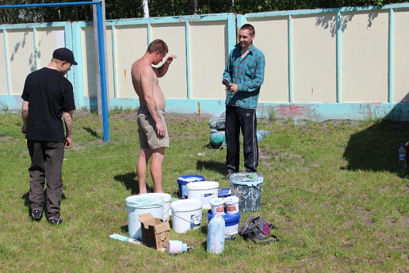 Целый день на жаре ребята работали над росписью забора, а дети с интересом наблюдали за всем происходящим, подходили к команде граффитистов, чтобы поздороваться и познакомиться с ними. В итоге однотонный забор за день чудесно преобразился: на нем появились добрые сказочные рисунки, которые уже помогают детям-инвалидам чувствовать себя лучше.