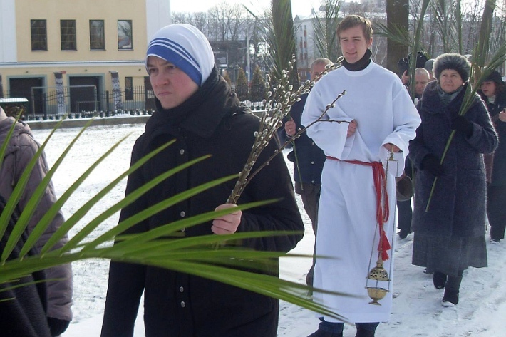 По традиции православных и католиков, в Пальмовое воскресенье верующие выстраиваются перед храмом для освящения букетов из верб, папоротников, пальм. Обычно в это время стоит теплая погода, но последние два года католики тоже праздновали Вербницу под снегом.