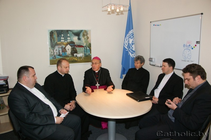 30 октября в представительстве ООН в Беларуси состоялась встреча делегации Католической Церкви с постоянным представителем ООН в республике и его сотрудниками. Католическую Церковь на встрече представляли Митрополит Минско-Могилевский архиепископ Тадеуш Кондрусевич, ответственный за СМИ Гродненской епархии и главный редактор газеты Гродненской епархии «Слово жизни» о. Павел Солобуда, пресс-секретарь ККЕБ о. Юрий Санько, директор Национального «Каритас» в Беларуси о. Виктор Гайдукевич SDB, директор благотворительного католического общества «Каритас» Минско-Могилевской архиепархии о. Александр Фоминых, директор благотворительного католического общества «Каритас» Гродненской епархии о. Виталий Добролович, директор Информационной Службы при ККЕБ о. Юрий Мартинович.