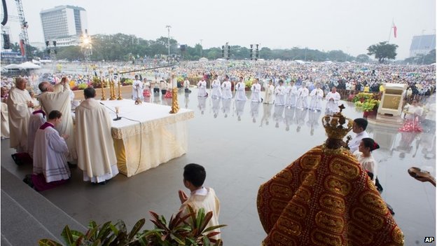 Во время трогательных приветствий после Мессы архиепископ Манилы поблагодарил Папу и сказал: «Каждый из нас, филиппинцев, хотел бы поехать вместе с Вами. Но не бойтесь: каждый филиппинец хочет отправиться с Вами, - но не в Рим, а на окраины!».