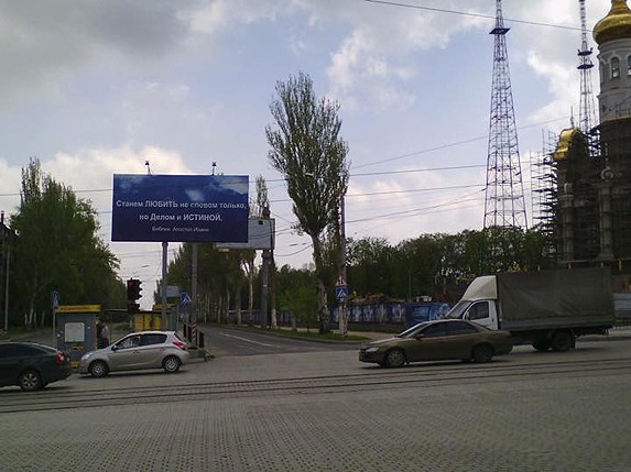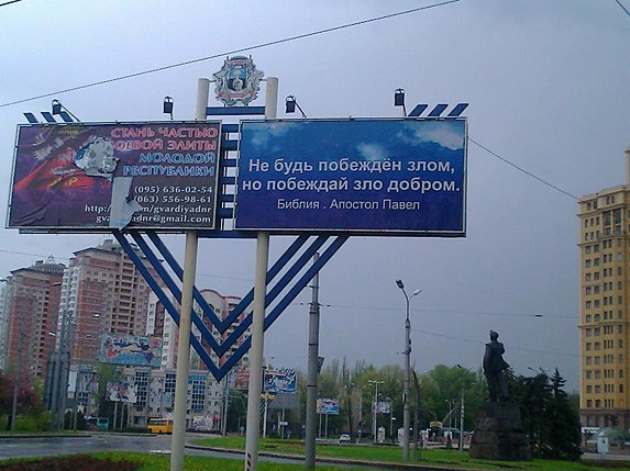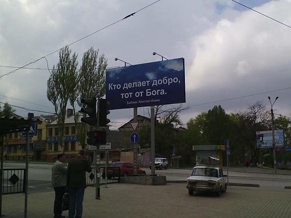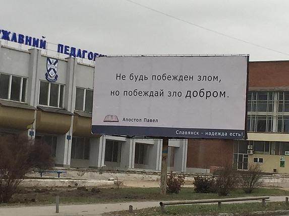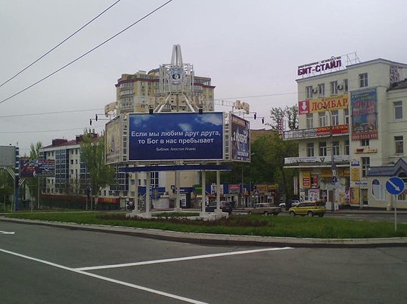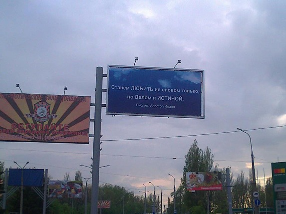 Донецк украсили билборды с цитатами из посланий Апостолов. «В этой войне только Слово Божие может сделать операцию на сердце человека, удалить ненависть и привить любовь. "Ибо слово Божие живо и действенно и острее всякого меча обоюдоострого: оно проникает до разделения души и духа, составов и мозгов, и судит помышления и намерения сердечные" (Евр.4:12)», - пишет на своей странице в Фейсбуке протестантский пастор Петр Дудник, который живет в городе Славянске и организовывает миссионерскую и гуманитарную деятельность в прифронтовых городах.