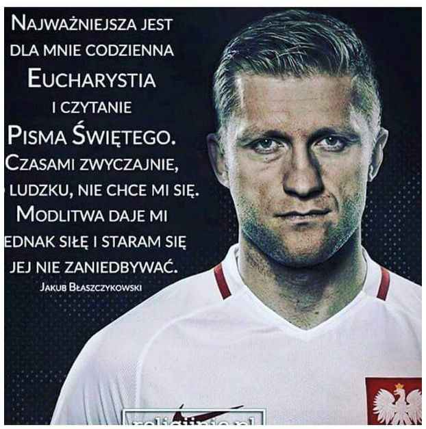 В социальных сетях появились демотиваторы с высказыванием полузащитника сборной Польши по футболу, которая пробилась в 1/4 финала турнира и 30 июня поборется за выход в полуфинал с командой Португалии. В четвертьфинал поляки прошли в том числе благодаря голу полузащитника Якуба Блащиковского. «Важнее всего для меня - ежедневная Евхаристия и чтение Божьего Слова. Порой все обычно, по-человечески, мне ничего не хочется. Но молитва дает мне силу, и я стараюсь не забывать о ней», - картинки с такими словами известного футболиста, который помогает побеждать сборной Польши, стали распространять в Фейсбуке и Твиттере.