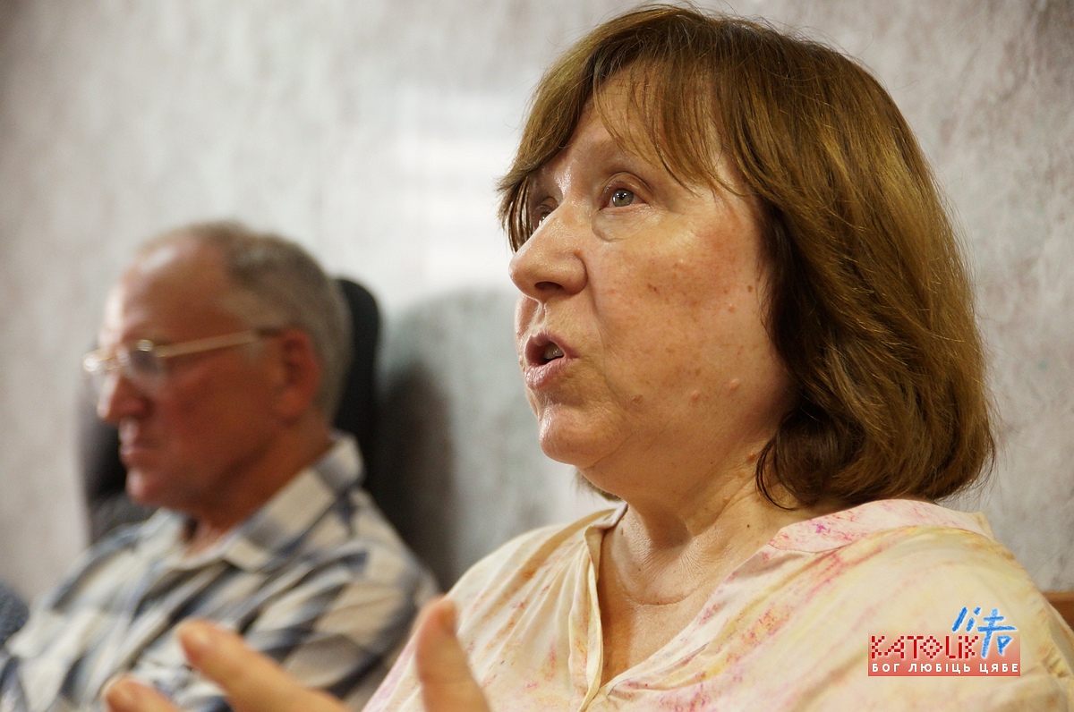 12 августа перед встречей с белорусской писательницей Светланой Алексиевич в Гомеле местные католики сделали ей небольшой подарок. Лауреату Нобелевской премии по литературе вручили Новый Завет на русском языке, открытку с иконой Иисуса Христа и словами молитвы к Божьему милосердию по-белорусски, а также глиняную кружку со словами «Супакой і дабро», которую сделали католические монахи-капуцины.