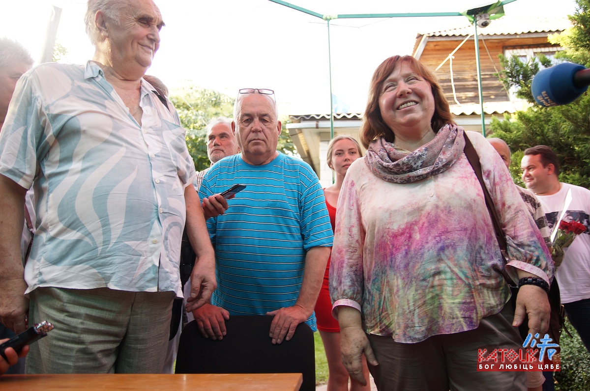 Светлана Алексиевич приняла подарок, улыбнулась и сказала: "Большое спасибо". А во время встречи, на которой в целом присутствовало почти сто человек, православная верующая, сотрудница Ветковского музея старообрядчества и белорусских традиций, поэтесса Лариса Романова вручила писательнице неглюбский рушник, вышитый орнаментом «осьмирожки», который считается символом Божьей Матери. Это была первая встреча нобелевского лауреата с читателями в регионах. После Гомеля Светлана Алексиевич посетит деревню Копаткевичи, где она училась в школе.