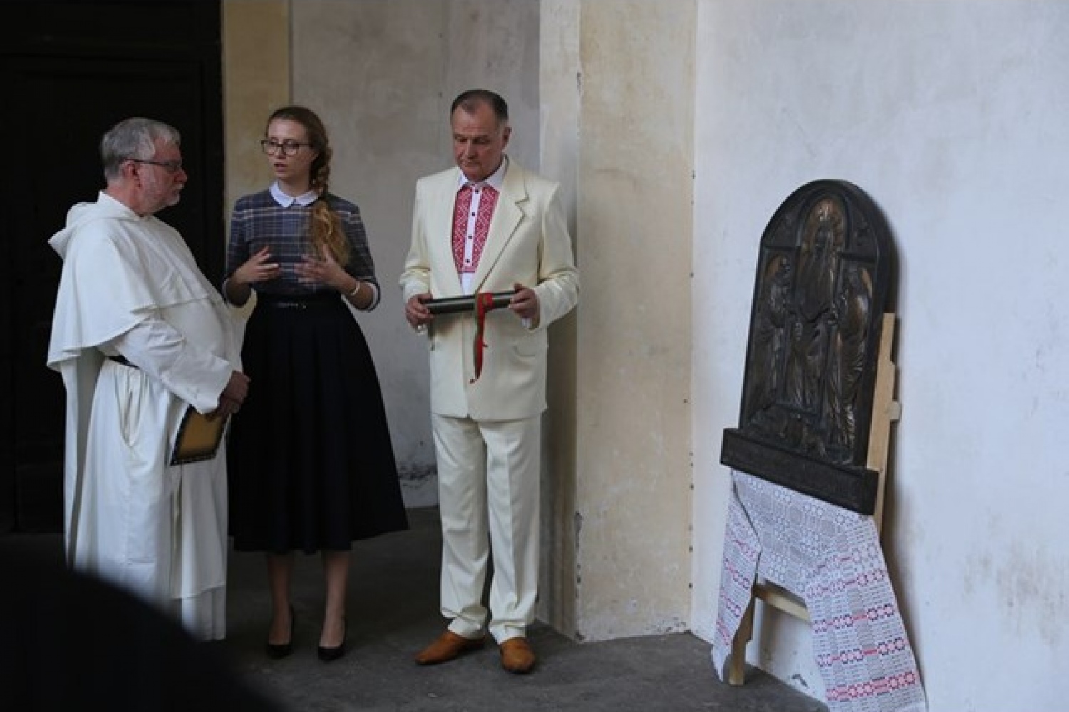 Перед церемонией передачи вывески Приору базилики св. Климента участники события спустились в ее нижнюю часть, где находится могила св. Кирилла, и открыли около нее небольшую временную таблицу на белорусском и итальянском языках со словами благодарности Богу за апостольскую деятельность святых Кирилла и Мефодия и за их влияние на белорусский язык и культуру.