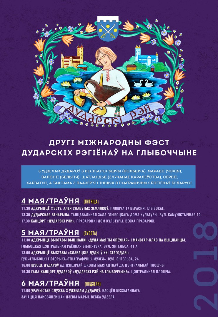 Глубокое приглашает на второй фестиваль дударских регионов "Дударскі Рэй - 2018", который в этом году состоится 4-6 мая. Праздник дуды пройдет под международный аккомпанемент приглашенных гостей из разных дударских регионов Польши, Словакии, Чехии, Шотландии, Латвии, Бельгии, Сербии и Хорватии.