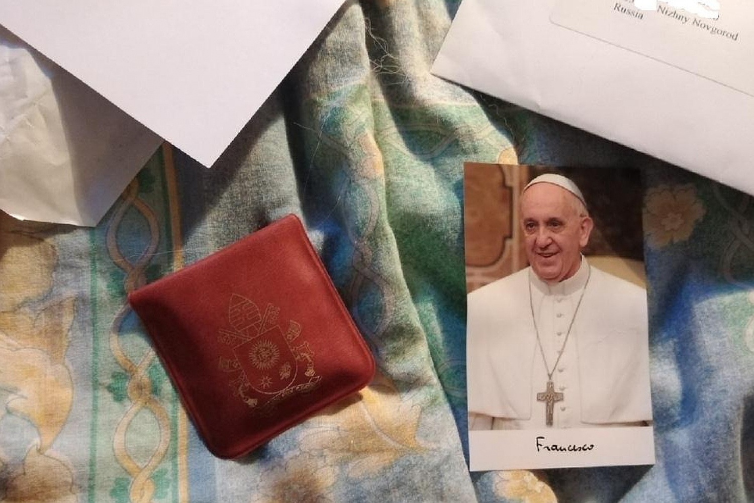 В адресе отправителя значилась Апостольская Нунциатура. В конверте была фотография Папы Франциска с его подписью, письмо и розарий, который, как сказано в письме, Папа лично освятил.