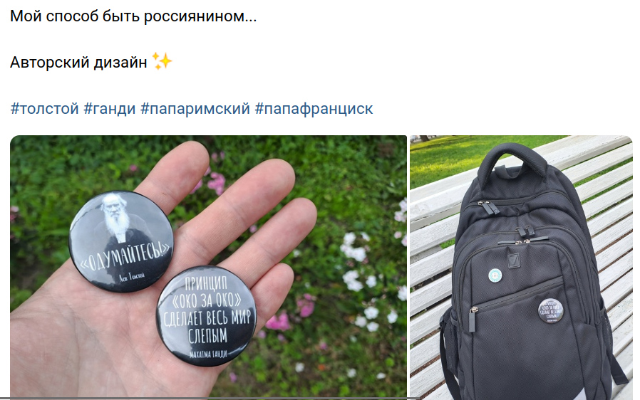 Один из участников телемоста с Папой опубликовал пост с заголовком, который отсылает к словам Понтифика: «Мой способ быть россиянином». Он выложил фото значков на своем рюкзаке с цитатами Льва Толстого («Одумайтесь») и Махатма Ганди («Принцип «око за око» сделает весь мир слепым»).
