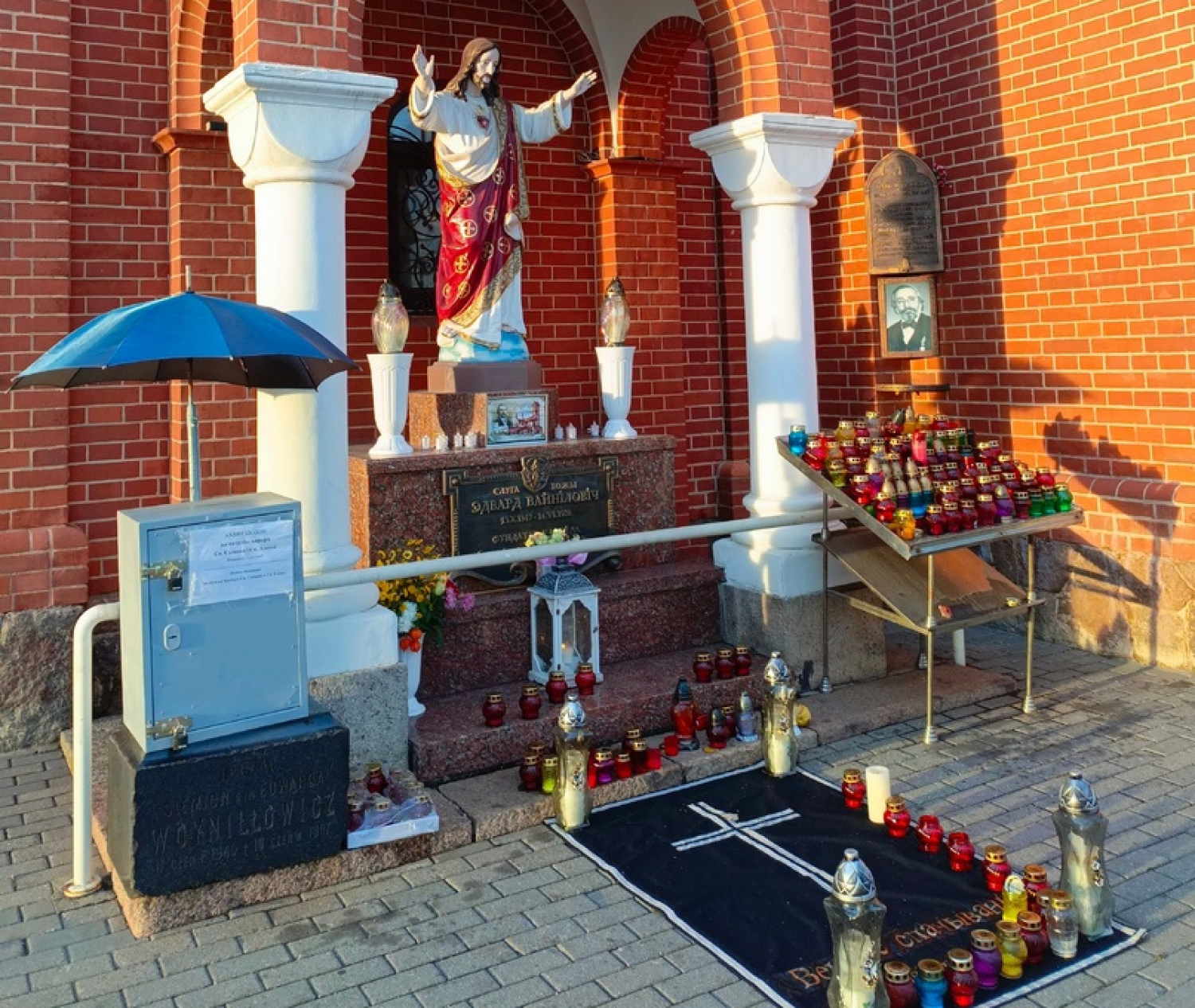 Верующие несут лампады к гробу спонсора строительства костела Слуги Божьего Эдварда Войниловича, что находится при храме. С молитвой за родных и близких умерших верующие ставят свечи у коврика с крестом и надписью «Вечнае спачыванне», а также на специальном столике.