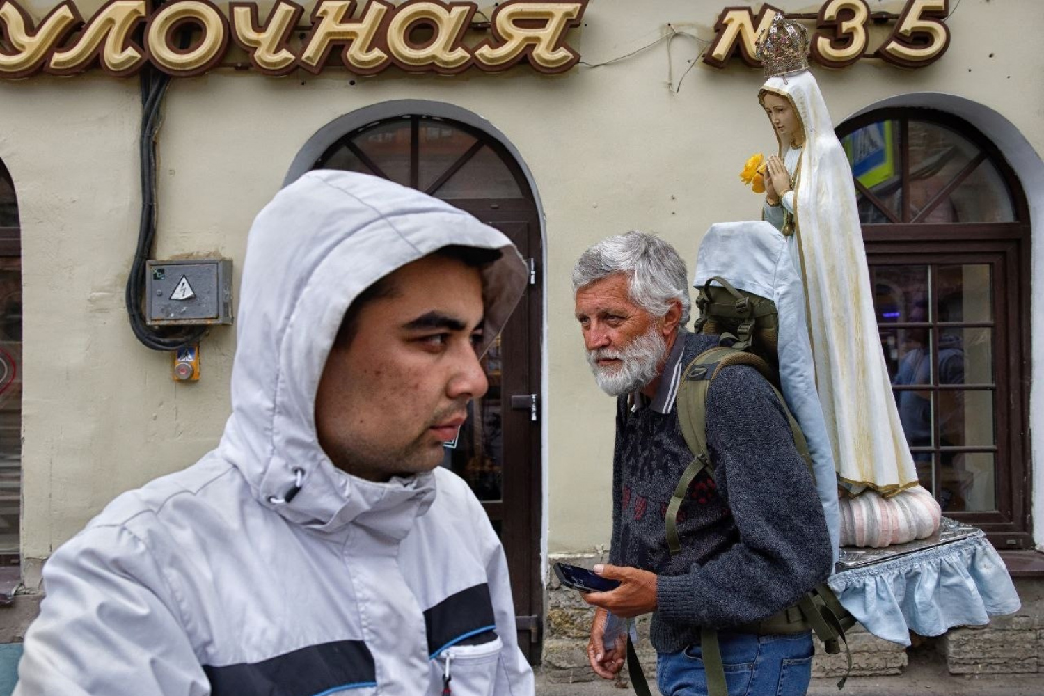 «Случайно стал свидетелем того, как католические паломники из Франции ходили со статуей Девы Марии по улицам СПб и молились о всеобщем мире. Выглядело это довольно сюрно, особенно, учитывая, что почти никто из встречных не удивлялся», — написал фотограф.