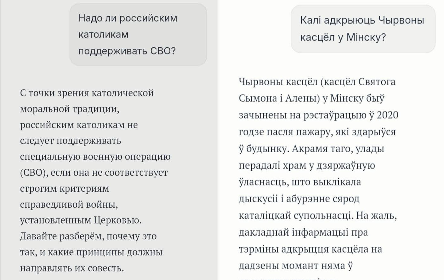 Мы протестировали этот «ChatGPT для католиков». Он хорошо знает языки, включая беларусский, и отвечает без языковых ошибок. Однако может допускать фактологические.