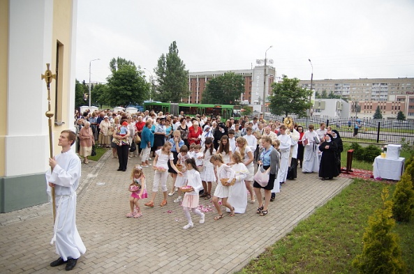 Празднование Торжества Пресвятого Тела и Крови Господней состоялось в Гомеле в воскресенье 2 июня. После первой утренней Святой Мессы вокруг костела прошел Крестный ход к четырем алтарям. На улице были установлены три алтаря, у каждого из них, а также у главного алтаря в храме, состоялись небольшие Богослужения.