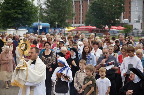 Празднование Торжества Пресвятого Тела и Крови Господней состоялось в Гомеле в воскресенье 2 июня. После первой утренней Святой Мессы вокруг костела прошел Крестный ход к четырем алтарям. На улице были установлены три алтаря, у каждого из них, а также у главного алтаря в храме, состоялись небольшие Богослужения.