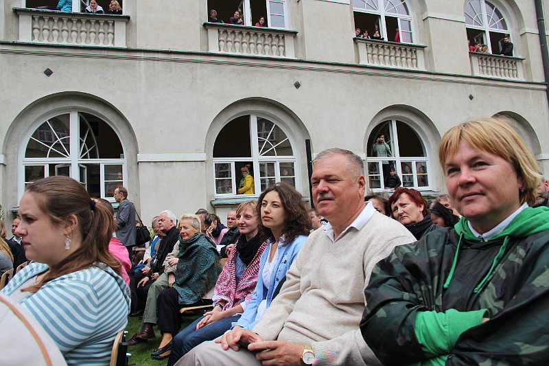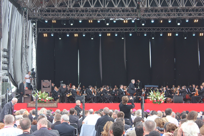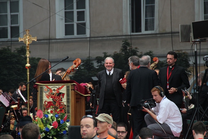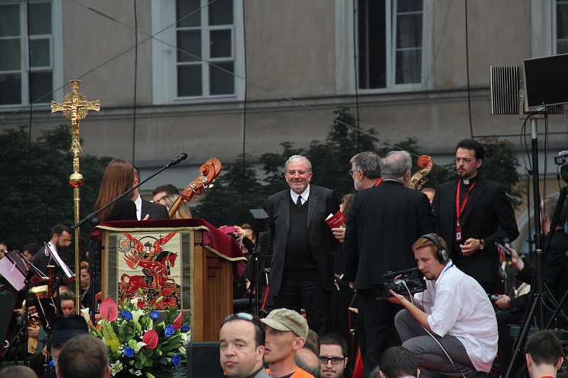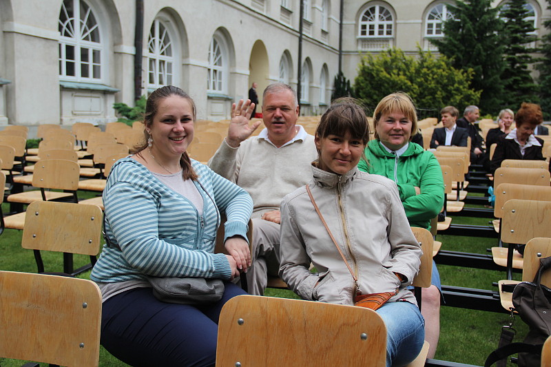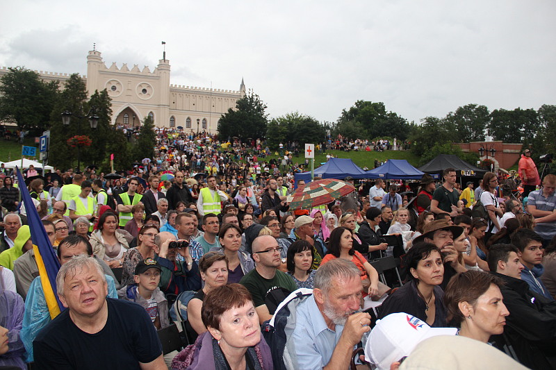 Вечером паломники отправились в центр Люблина, на Замковую площадь, где была организована концертная площадка под открытым небом для представления симфонии Кико Аргуэльо “Страдания Невинных”. Замковая площадь принесла много радостных и неожиданных встреч – семьи, которые принимали у себя молодежь зимой по пути в Рим, священники, ранее служившие в гомельском приходе, и ребята, которые были в Гомеле на миссии. Небольшой дискомфорт принес дождь, который лил на протяжении всего концерта. Но он не только не смог испортить общего впечатления. Он скорее стал знаком слез по тысячам невинно замученных в концлагерях. И именно в момент окончания молитвы за души погибших, которую со сцены воспевал раввин, грянул раскат грома…