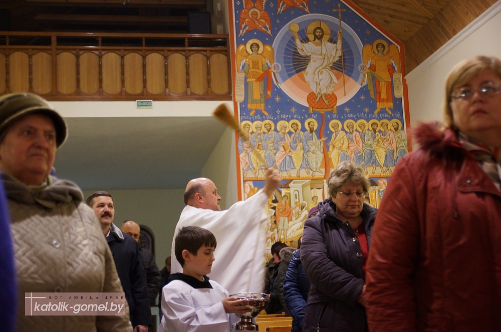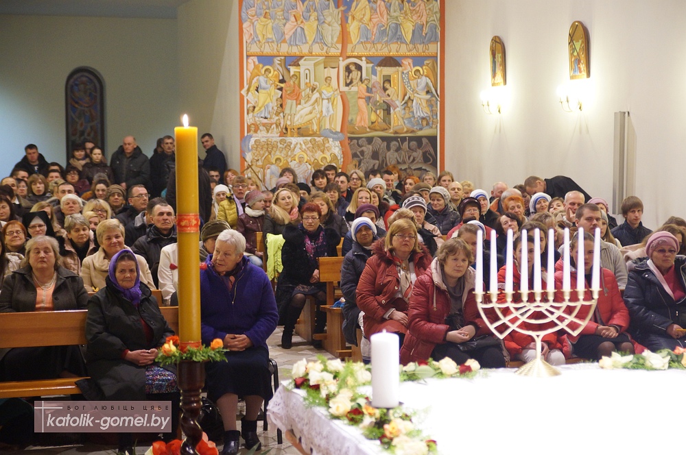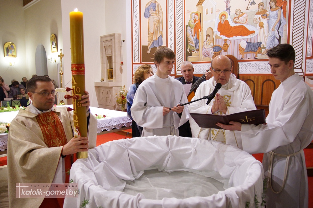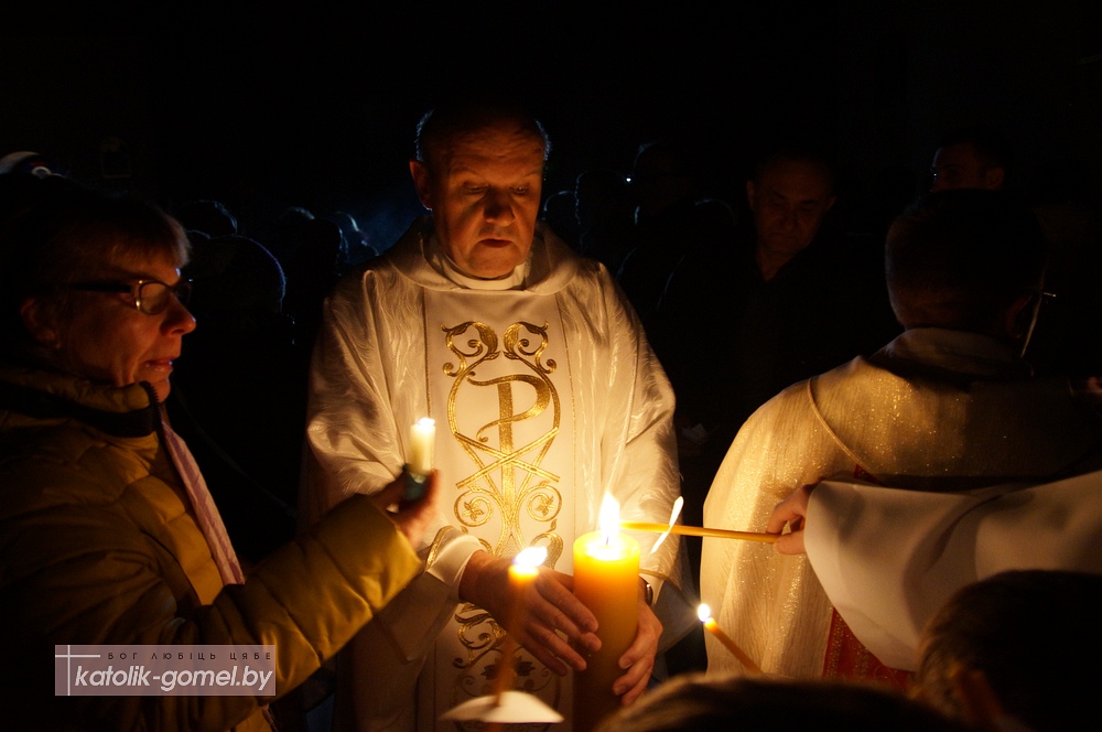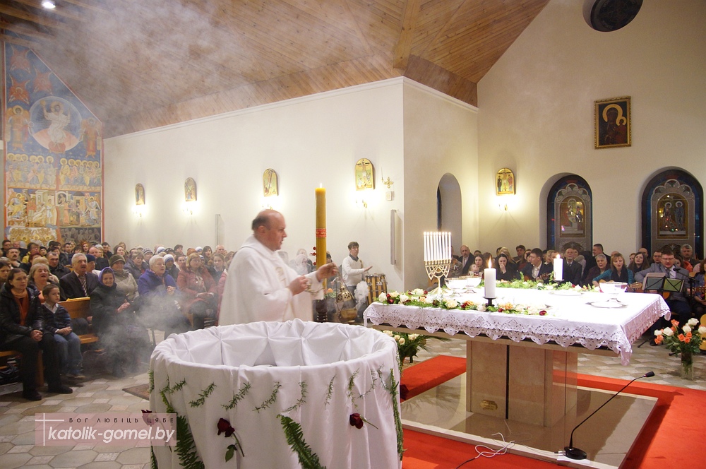Сотни гомельских католиков также собрались вместе в Пасхальную ночь, молились и слушали Слово Божье до самого утра. Из-за нехватки мест в костеле службы проводились параллельно в двух залах. Многие пришли в эту ночь с детьми, ведь передать свою веру детям - это долг каждого христианина. И многие обряды специально проводились именно для маленьких прихожан.