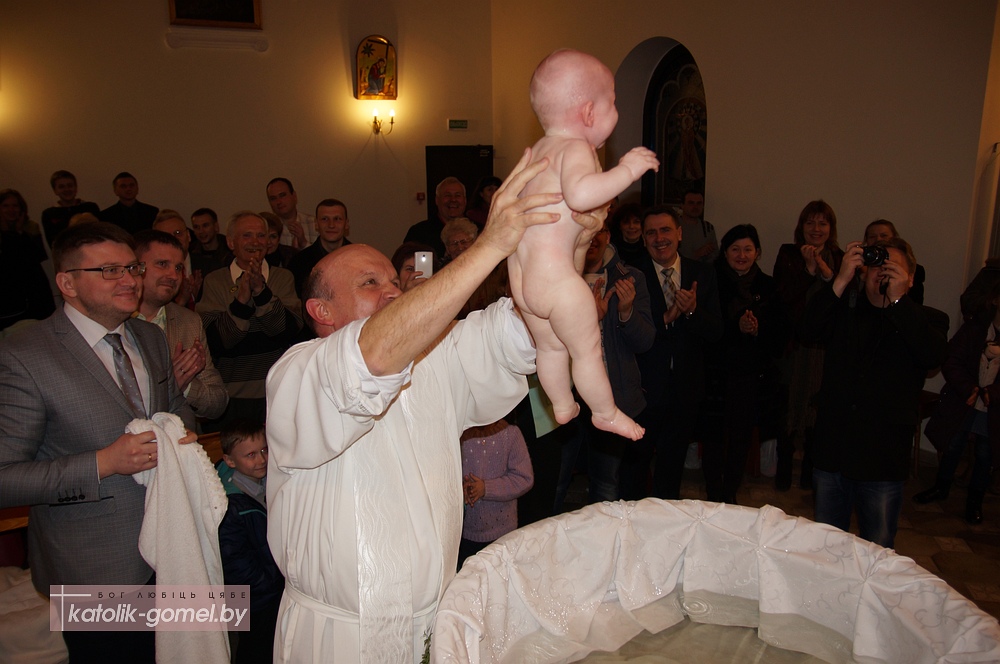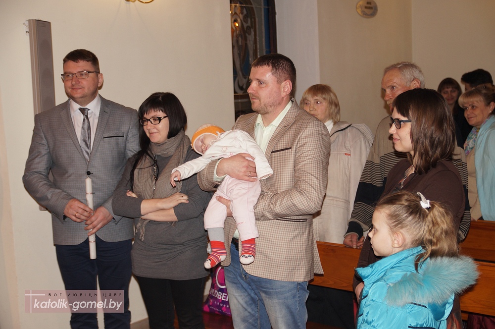 Во время всенощного бдения в Гомеле торжественно крестили новорожденного. Своего пятого ребенка - маленькую Павлину - в костел принесла многодетная семья Мякшиновых. Крестными также были многодетные супруги, у которых уже трое детей.