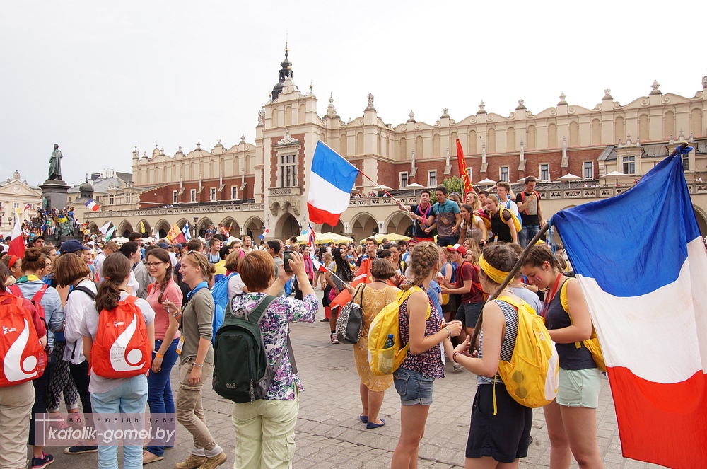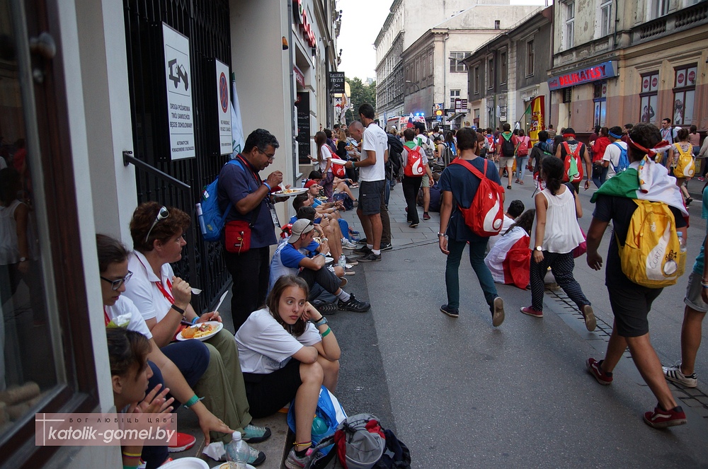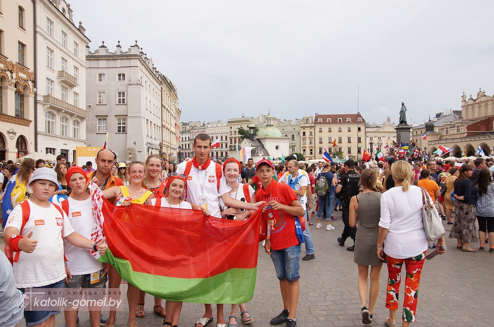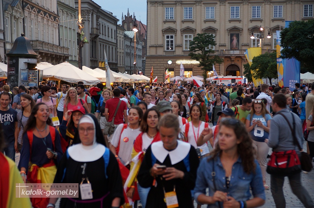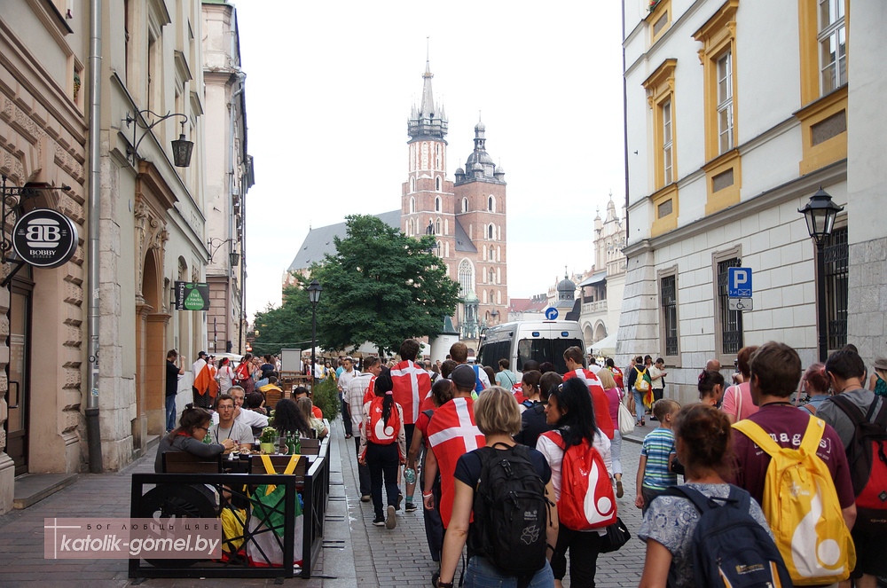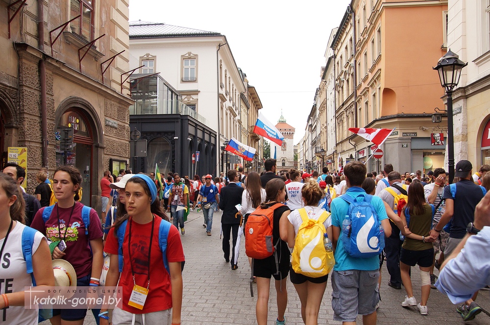 Не побывав в центре событий, невозможно осознать, что происходило в городе: группы молодых верующих из разных континентов раскрасили улицы флагами своих стран, паломники из разных континентов не стеснялись выражать радость кто как может, в том числе танцами под барабаны на главной площади. Белорусов тоже можно было заметить в центре города: вместе с верующими из Украины, Канады, Испании и других стран молодые католики из Беларуси «оккупировали» памятник Мицкевичу, пели песни. «На Беларусі Бог жыве!» - услышал центр Кракова.