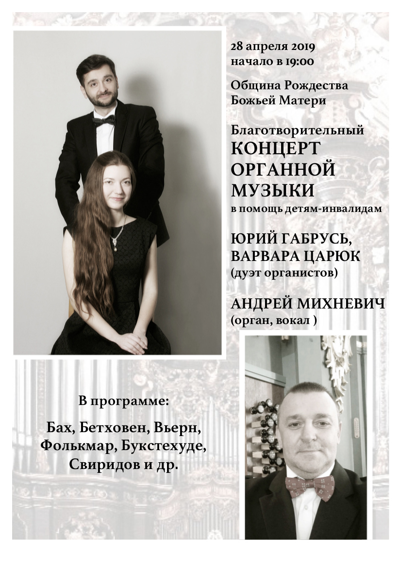 В воскресенье, 28 апреля, когда православные будут праздновать Воскресение Христово, в гомельском католическом храме пройдет Пасхальный концерт. Впервые в Гомеле выступит известный белорусский дуэт. Оригинальные произведения для органа в четыре руки и четыре ноги, а также транскрипции известных симфонических произведений исполнят молодые органисты Государственного камерного хора Беларуси Юрий Габрусь и Варвара Царюк. Также выступит органист минского Красного костела Андрей Михневич (орган, вокал). Прозвучат произведения Баха, Бетховена, Вьерна, Фолькмара, Букстехуде, Свиридова и других композитиоров.