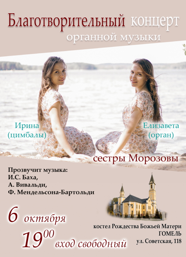 Благотворительный концерт органной музыки пройдет в гомельской римско-католической церкви в воскресенье, 6 октября. Концерт дадут сестры Ирина и Елизавета Морозовы. На органе и цимбалах они сыграют произведения Баха, Вивальди, Мендельсона-Бартольди и других известных композиторов. Начало - в 19.00, адрес костела: ул. Советская, 118 (остановки «Гостиница «Турист», «Университет»).
