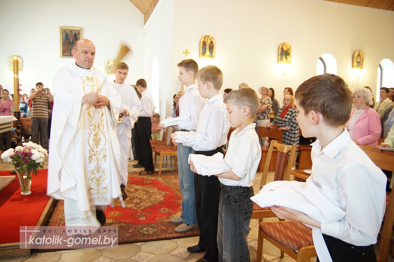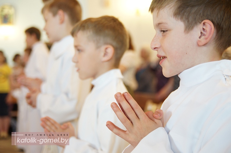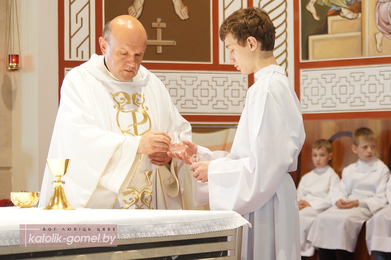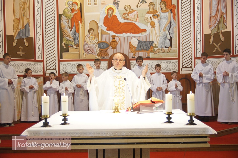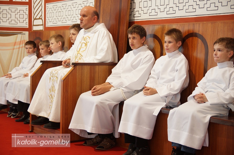 18 мая в торжественной обстановке во время воскресной Святой Мессы настоятель гомельского римско-католического прихода принял в министранты семерых парней. После подготовки, длившейся несколько месяцев, юные католики стали служить у алтаря вместе со священником. Самое ответственное дело для министрантов - это помощь в подготовке Святых Даров для Евхаристии.